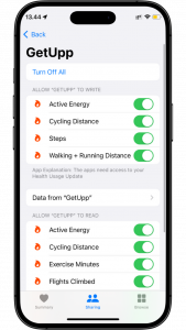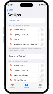 Here, you press the “turn all on” button, which allows the GetUpp app to access all the displayed health data from your phone.